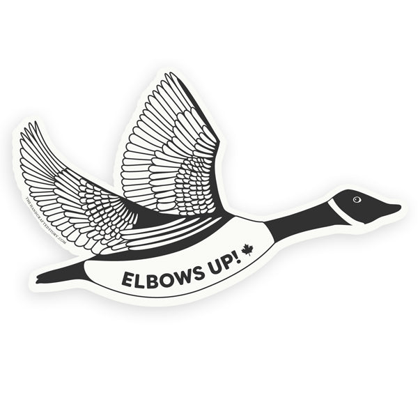 Show your respect and enthusiasm for Canadian sovereignty with this black and white Canada Goose sticker, which says "Elbows Up!"