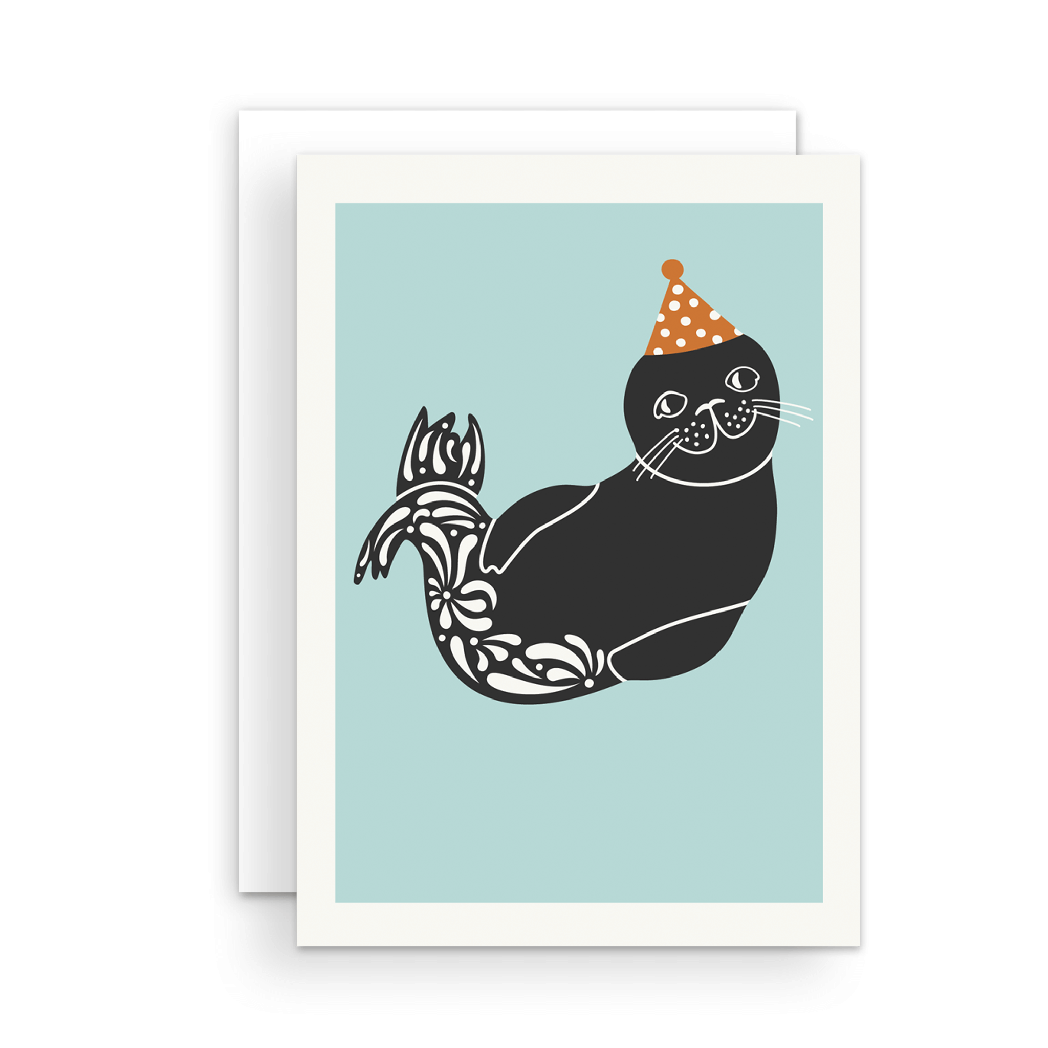 Illustration of a harbour seal wearing a birthday hat with a white border.