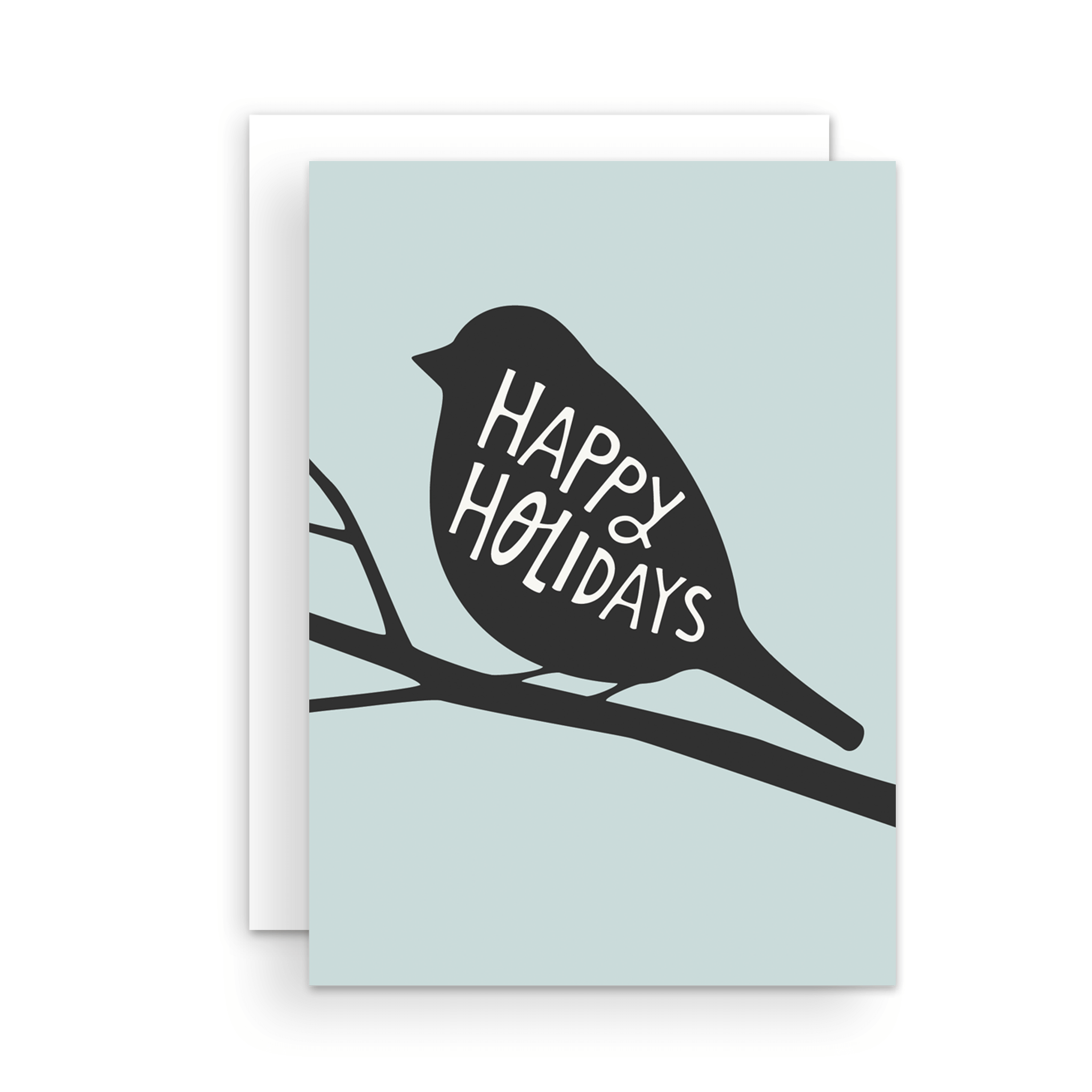 Send warm wishes this holiday season with this charming illustration of a small bird perched on a branch, with the hand-lettered phrase 'Happy Holidays' on a pale blue background.