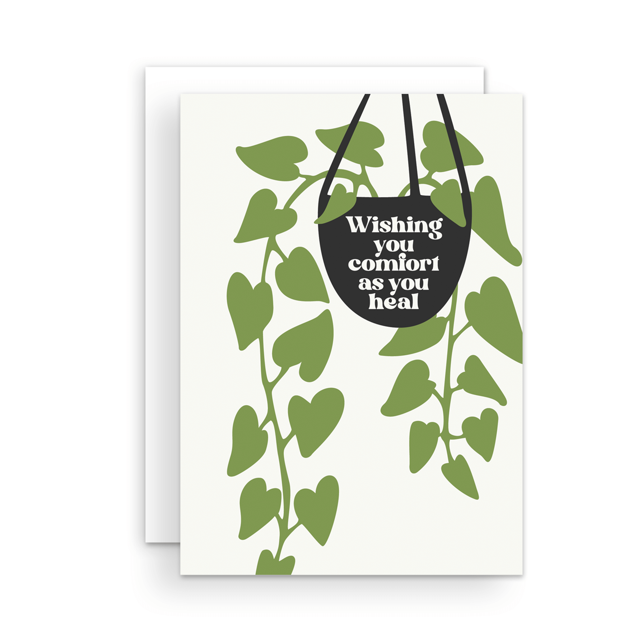 A card with the phrase "Wishing you comfort as you heal" on a drawing of a hanging houseplant vine.