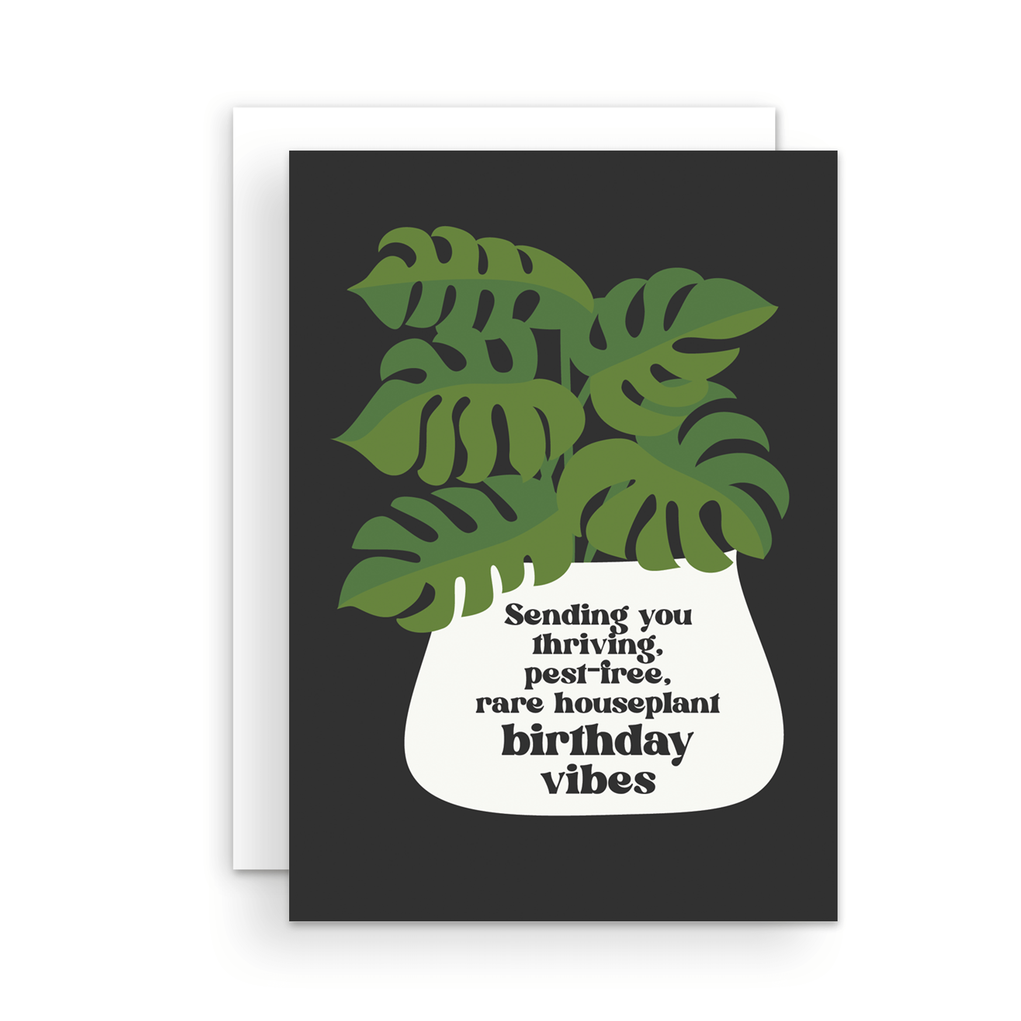 A card with the words "Sending you thriving, pest-free, rare houseplant birthday vibes" on a drawing of a potted houseplant.