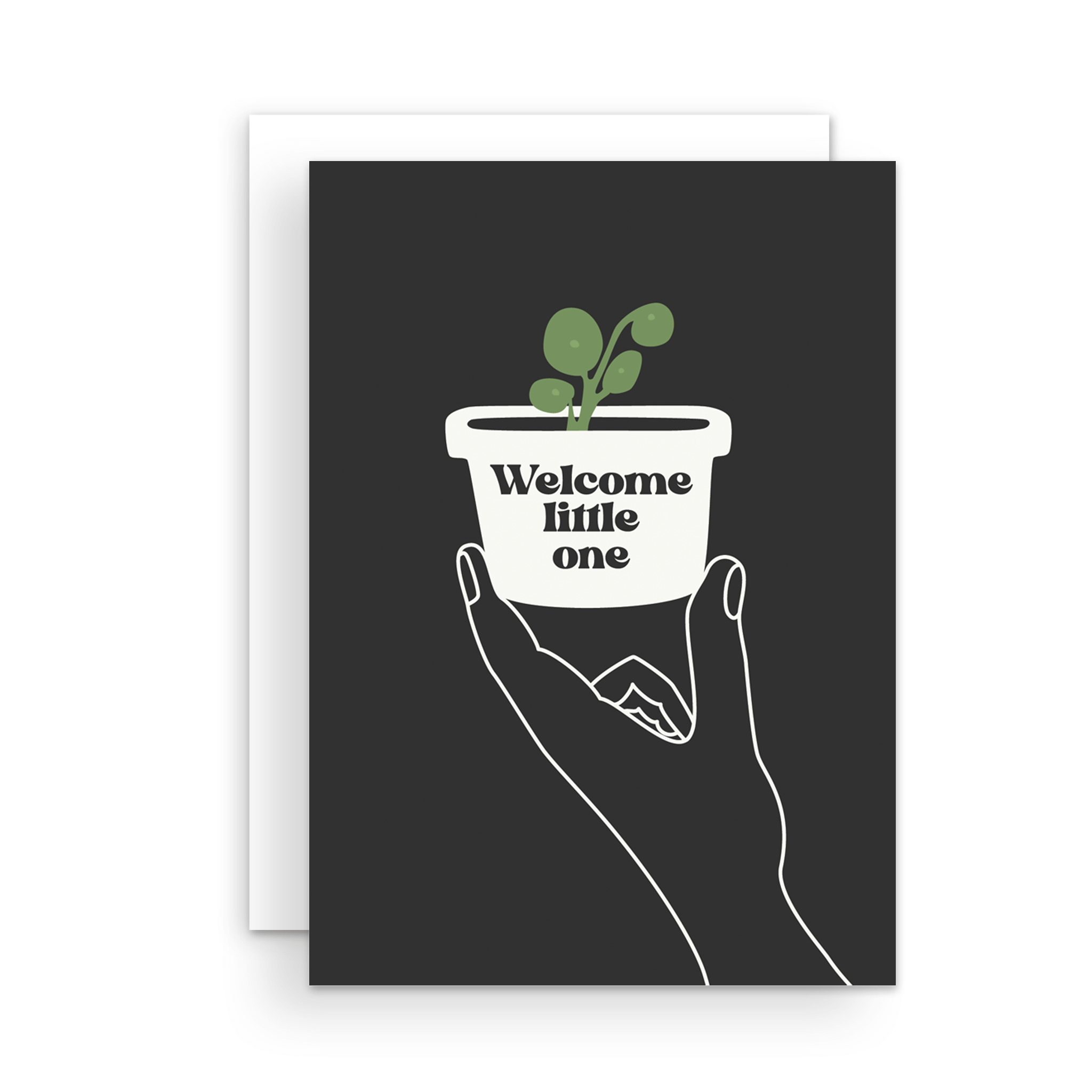 A card that says "Welcome little one" with a drawing of a hand holding a tiny potted houseplant.