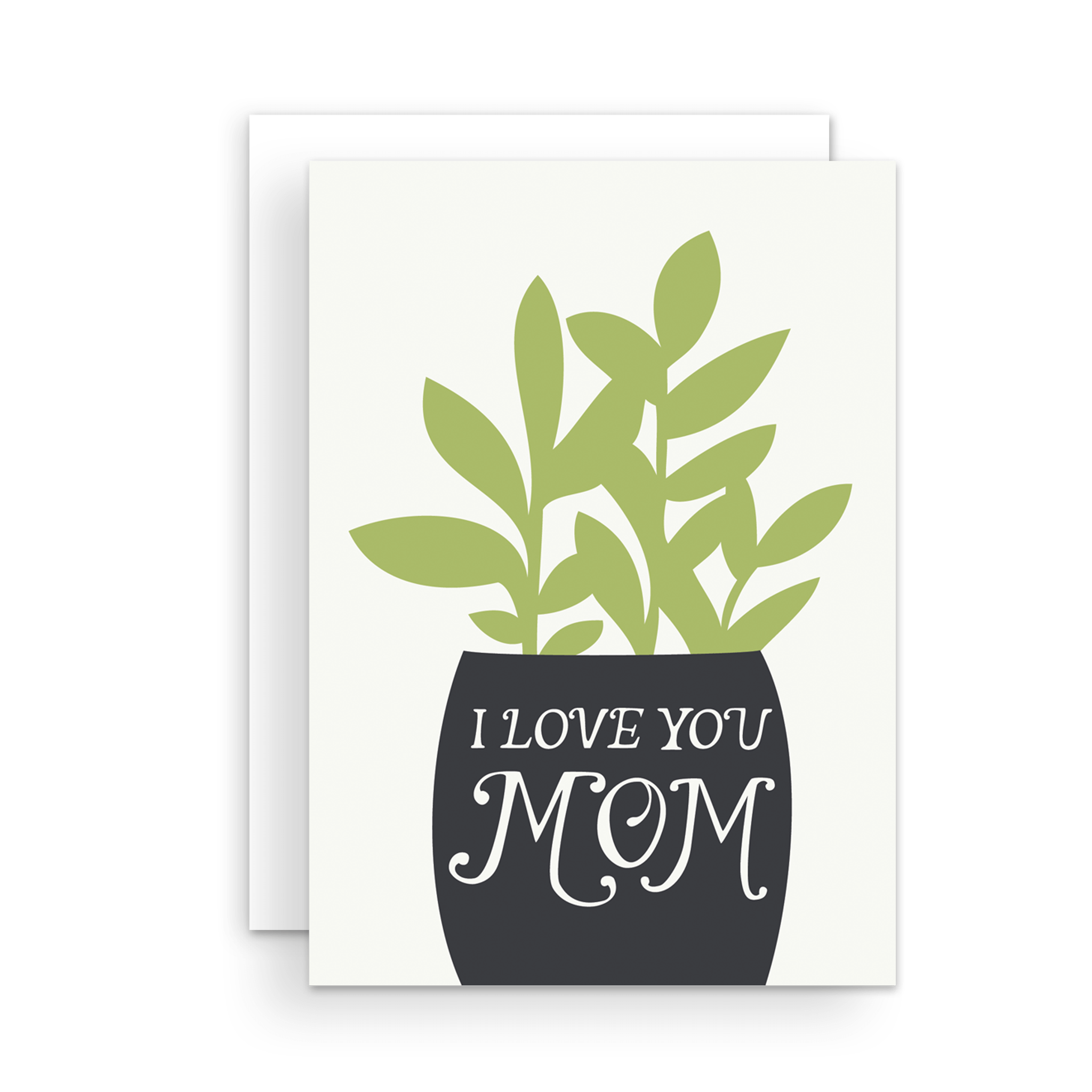 A sweet way to remind Mom she’s loved. A card with the hand-lettered phrase "I love you Mom" written on a drawing of a potted houseplant.