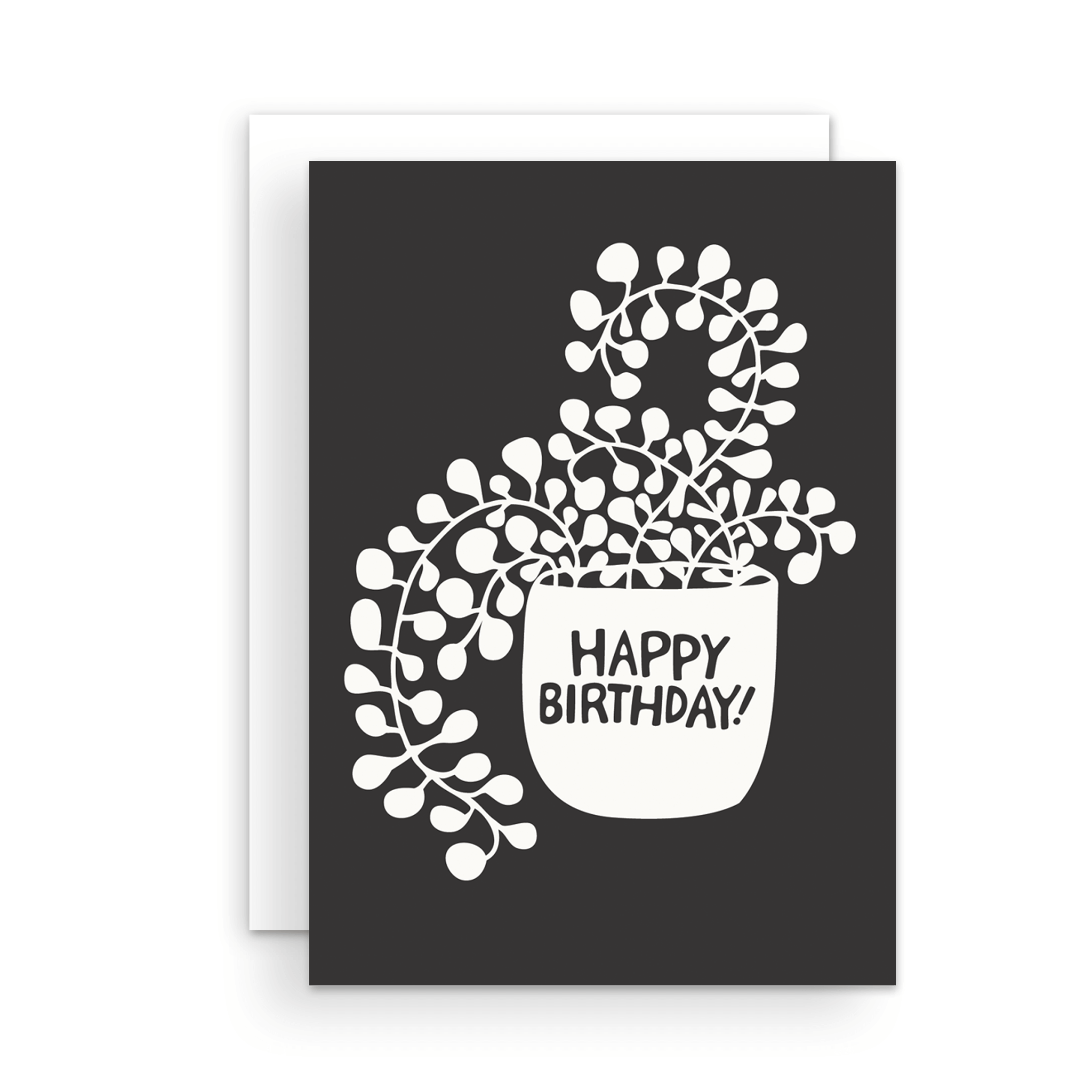This birthday card is perfect for plant lovers and those who appreciate a touch of nature. This black and white card features the silhouette of a houseplant .