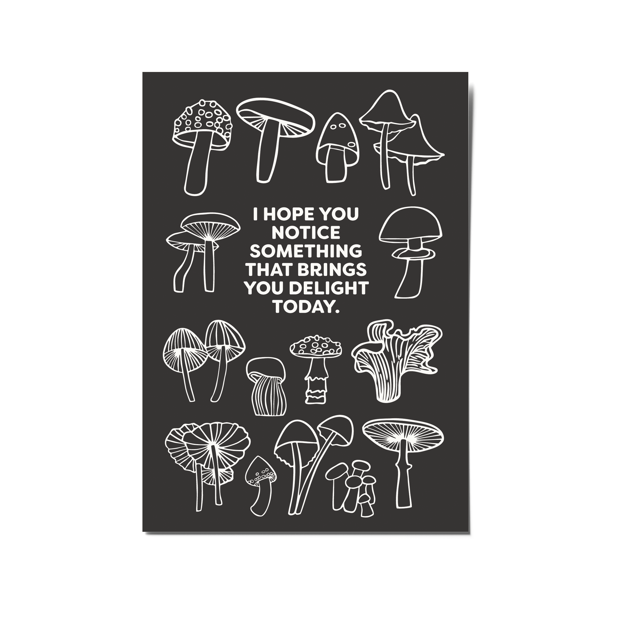A black and white postcard of hand drawn mushrooms and the words "I Hope You Notice Something That Brings You Delight Today."