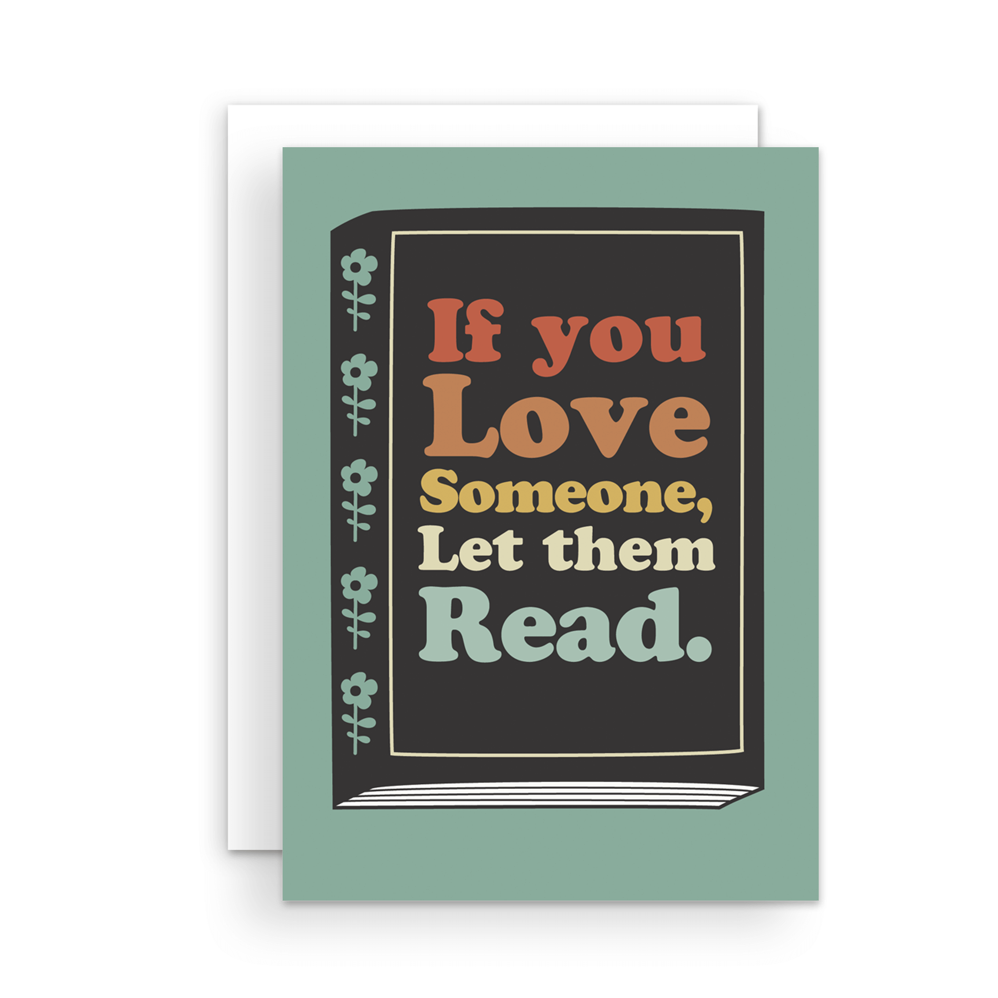 For the most bookish people in your life, this card that shows a book cover that says "If You Love Someone, Let Them Read" greeting card.
