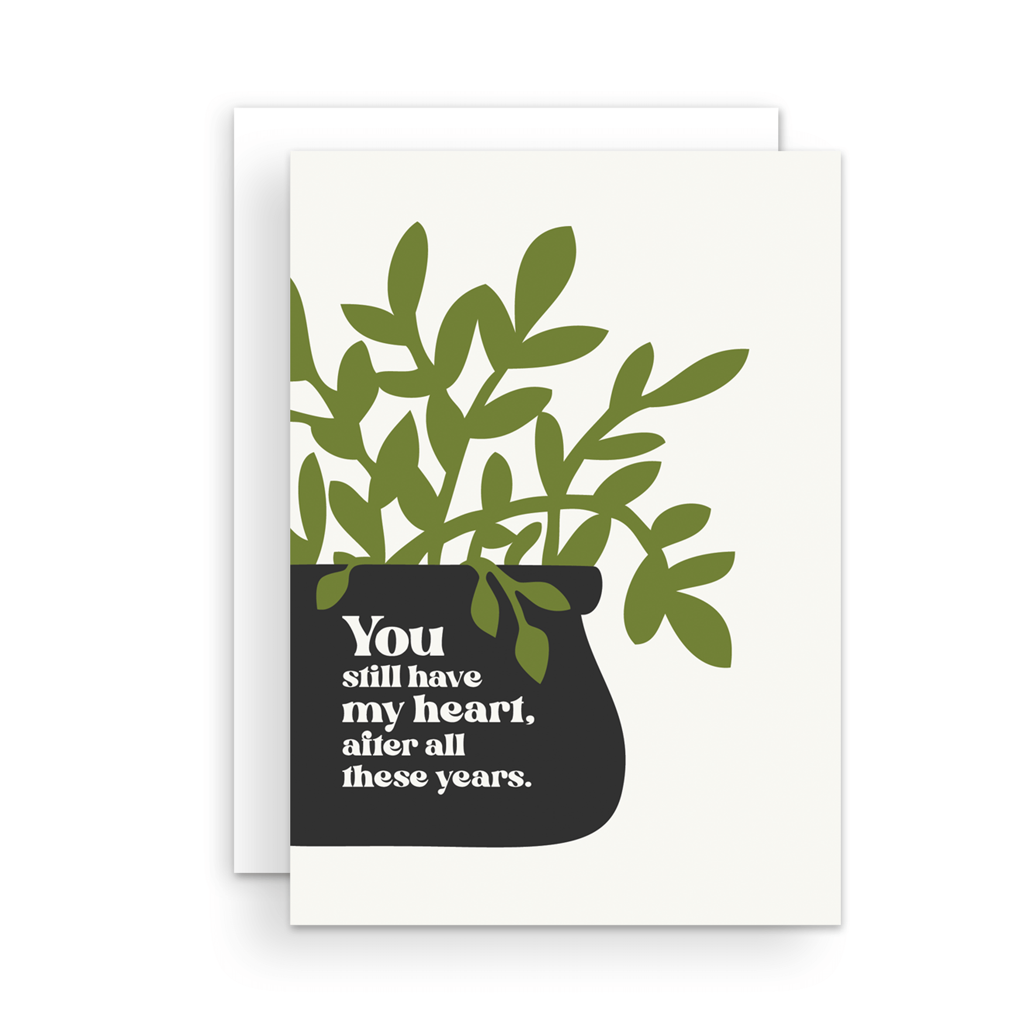 A card that says "You still have my heart after all these years" on a potted houseplant, with a white background.