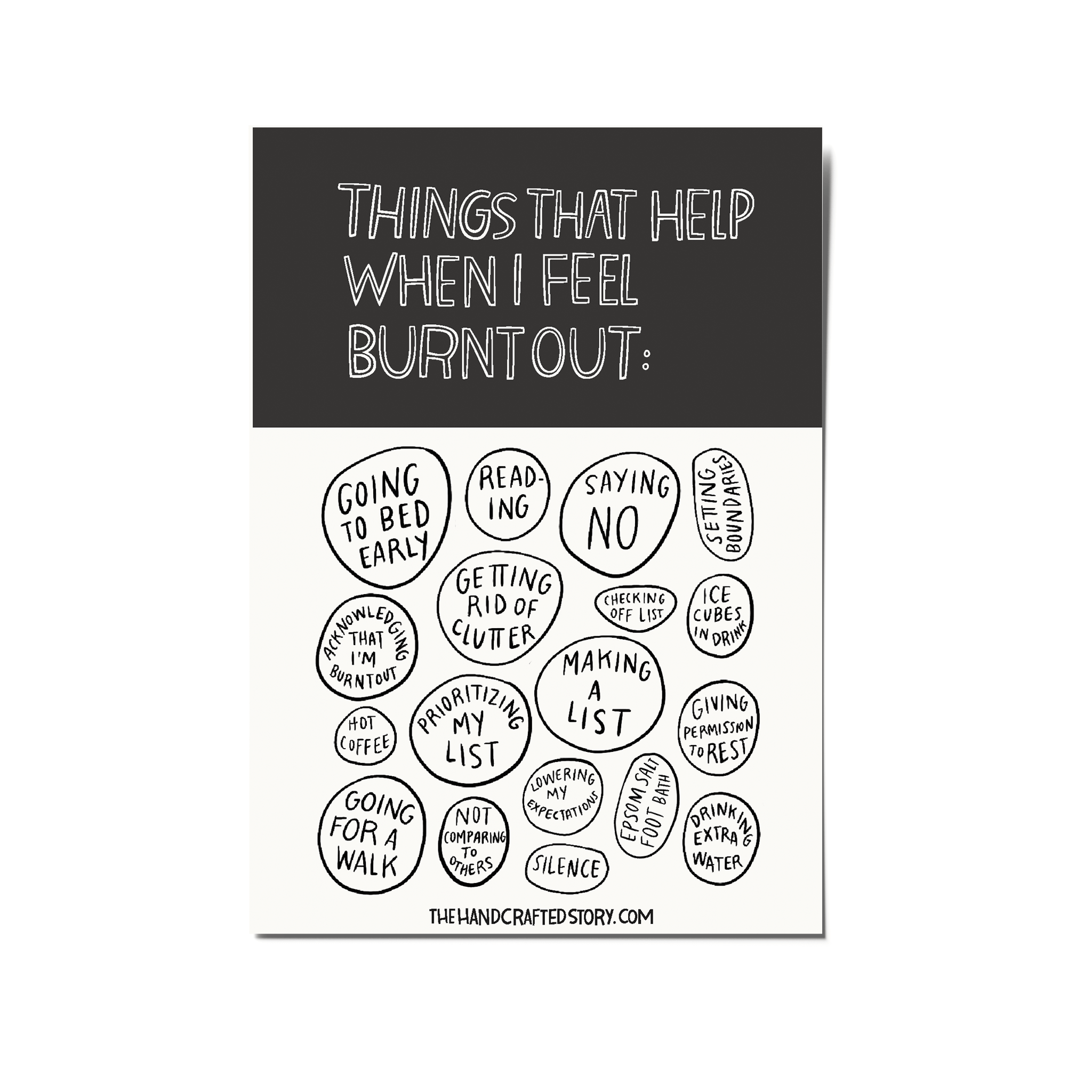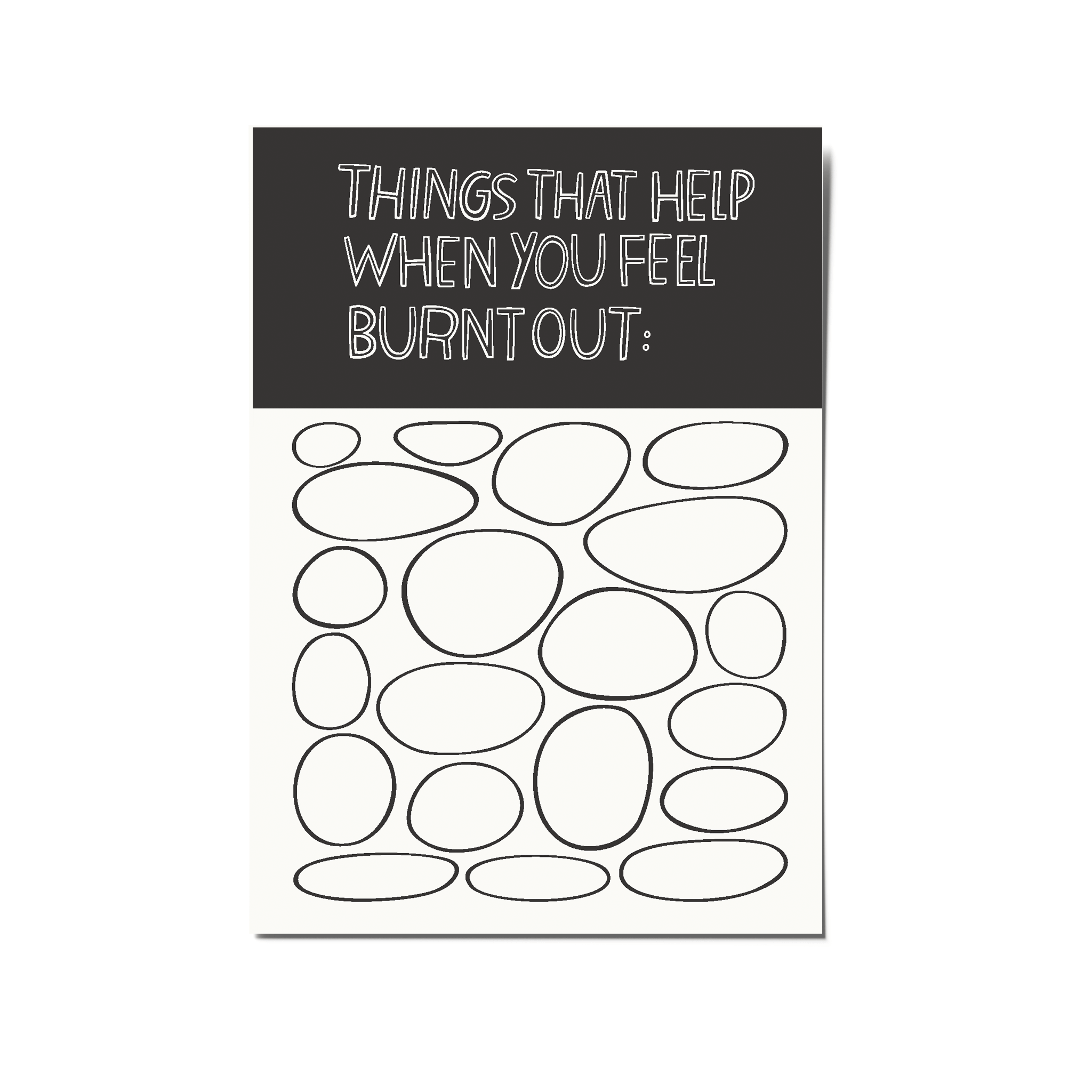 This black and white postcard says "Things that help when I feel burnt out" in hand drawn letters. On one side, the hand drawn circled give examples like: going to bed early, reading, saying no, making a list, etc. And the other size of the postcard has empty circles for you to fill in your own things that help when you feel burnt out.