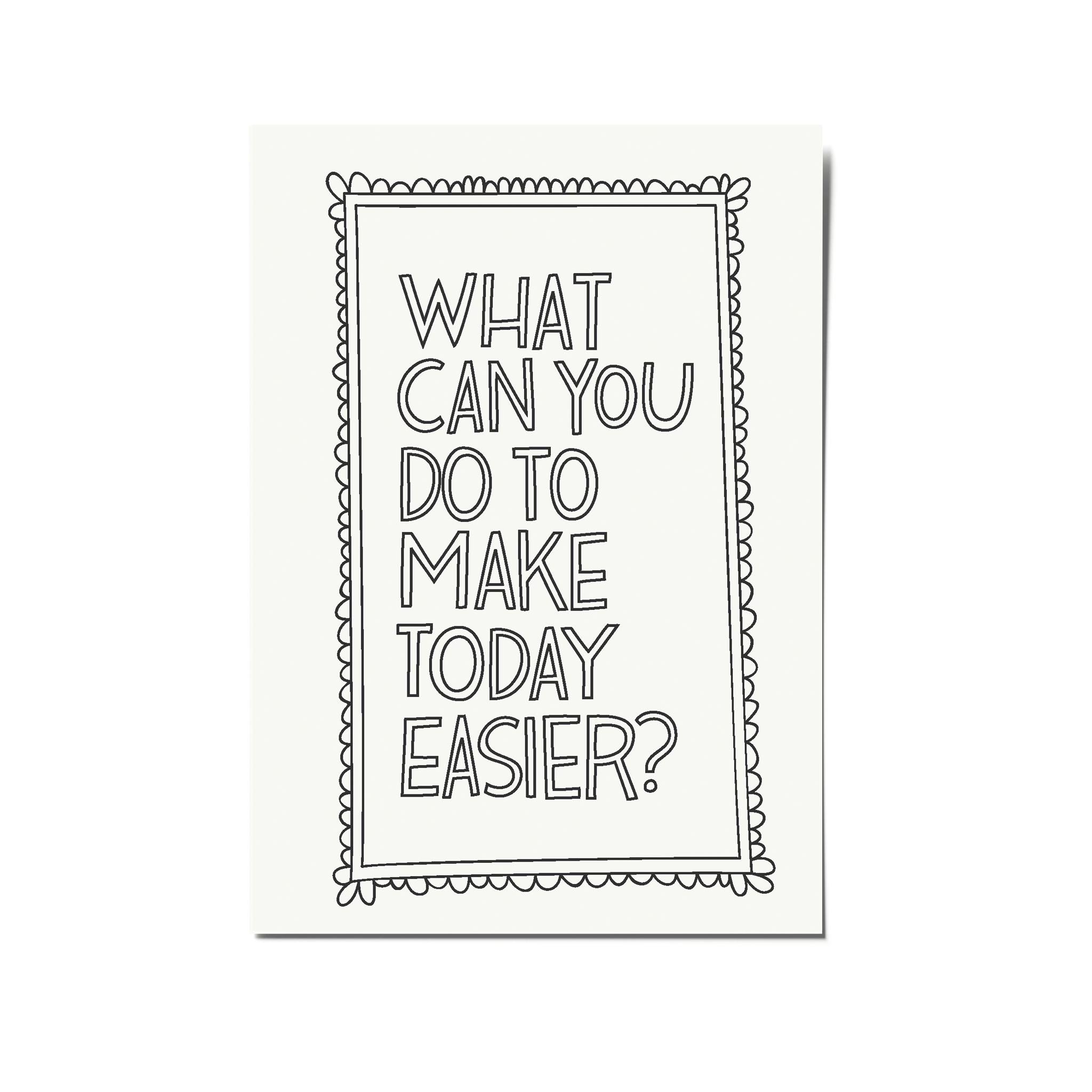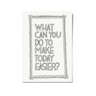 This black and white postcard says "What can you do to make today easier?" in hand drawn letters.