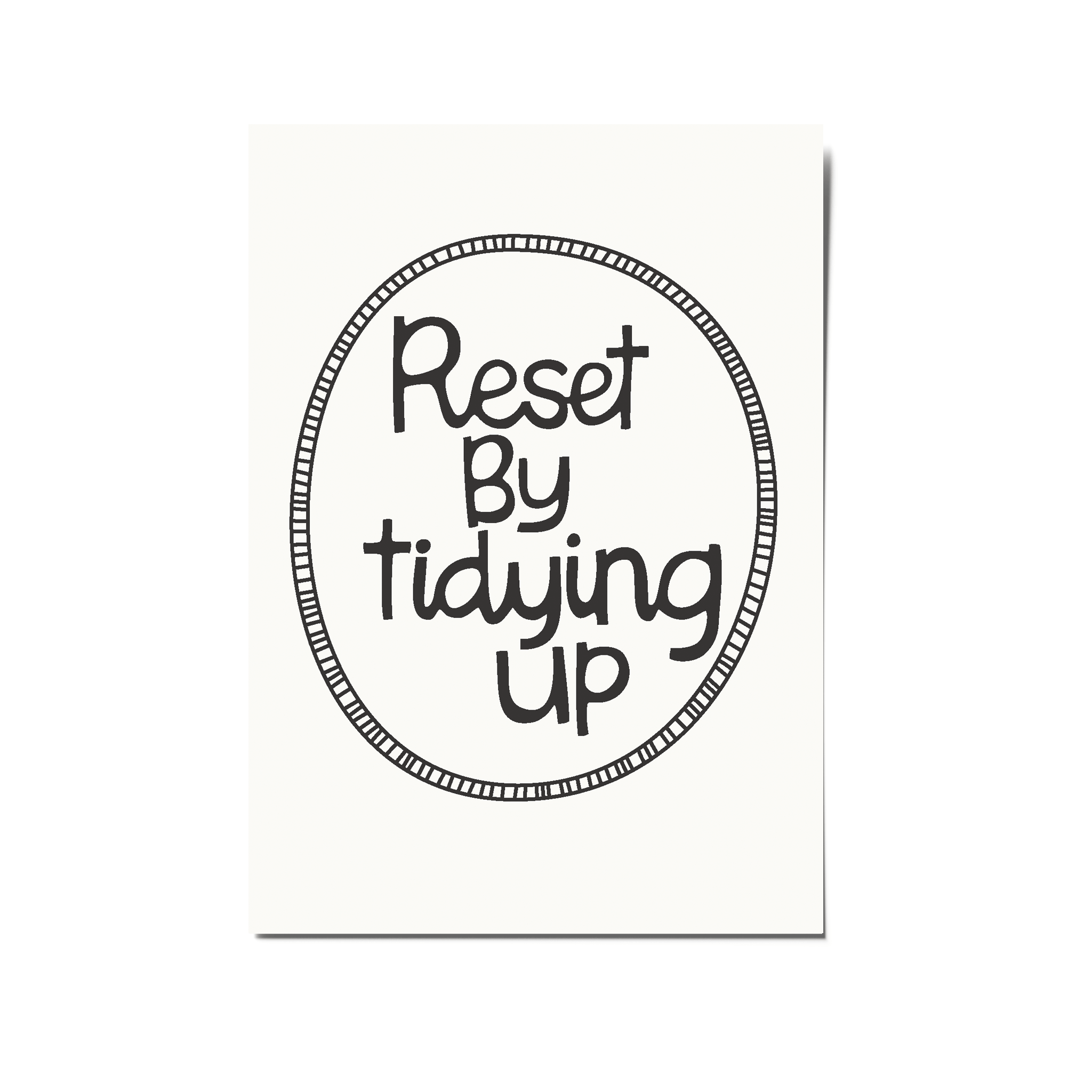 This black and white postcard says "Reset By Tidying Up" in hand drawn lettering.