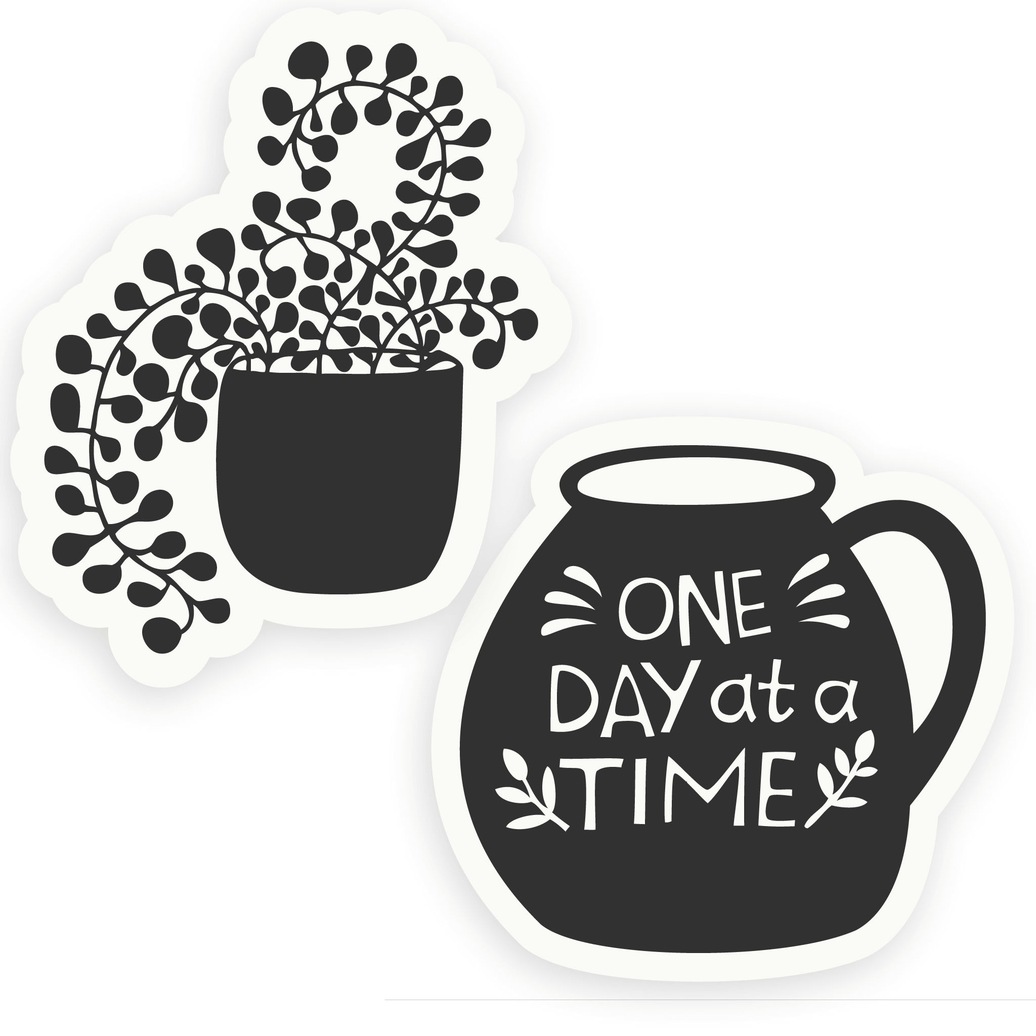 Embrace self-care with this charming sticker set featuring the uplifting phrase "One Day at a Time" and a minimalist houseplant design.