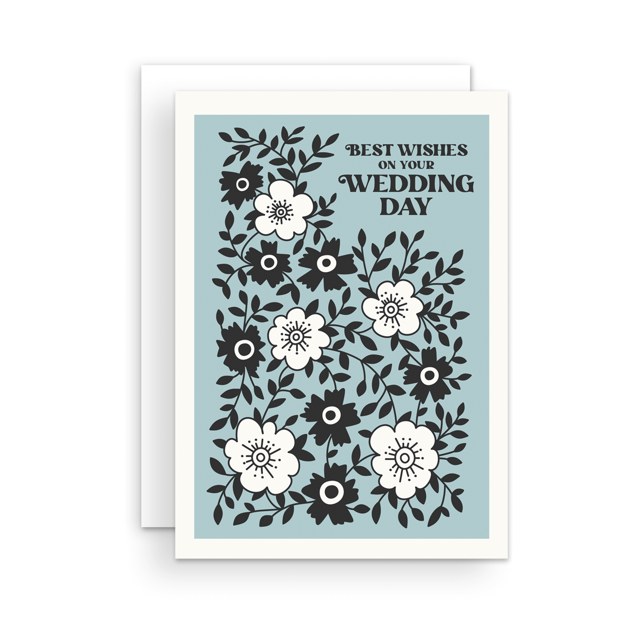 "Best Wishes On Your Wedding Day" blue floral card with a white border.