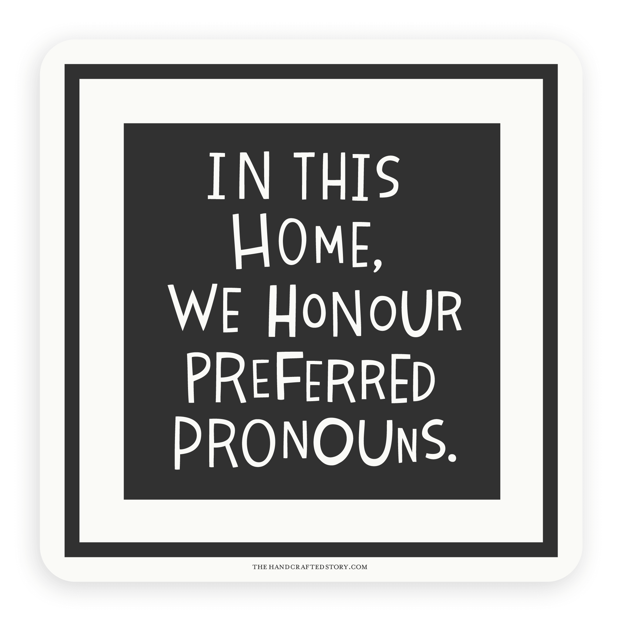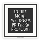 A black and white sticker that says "In this home, we honour preferred pronouns." on a drawing of a picture frame.