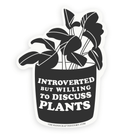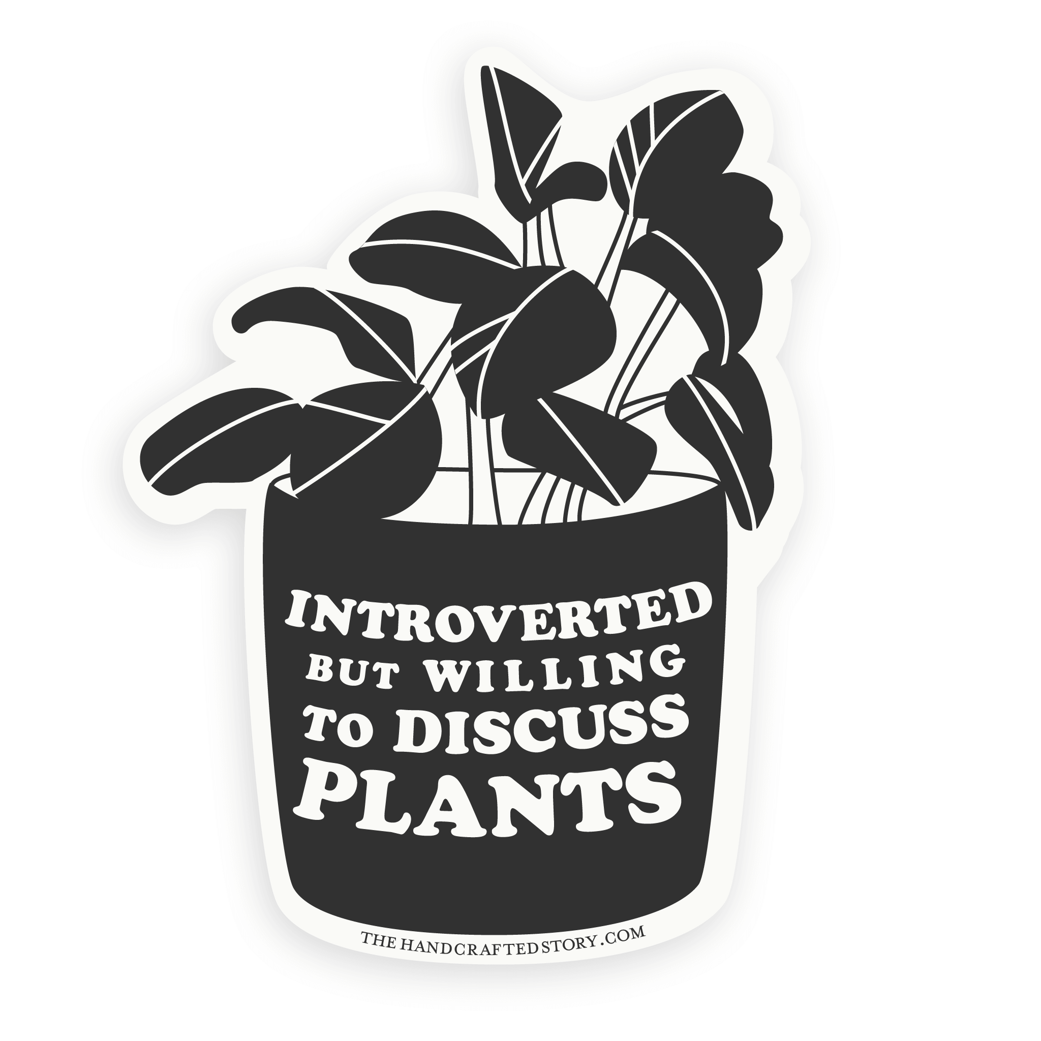 A black and white sticker that says "Introverted but willing to discuss plants" on a drawing of a houseplant.