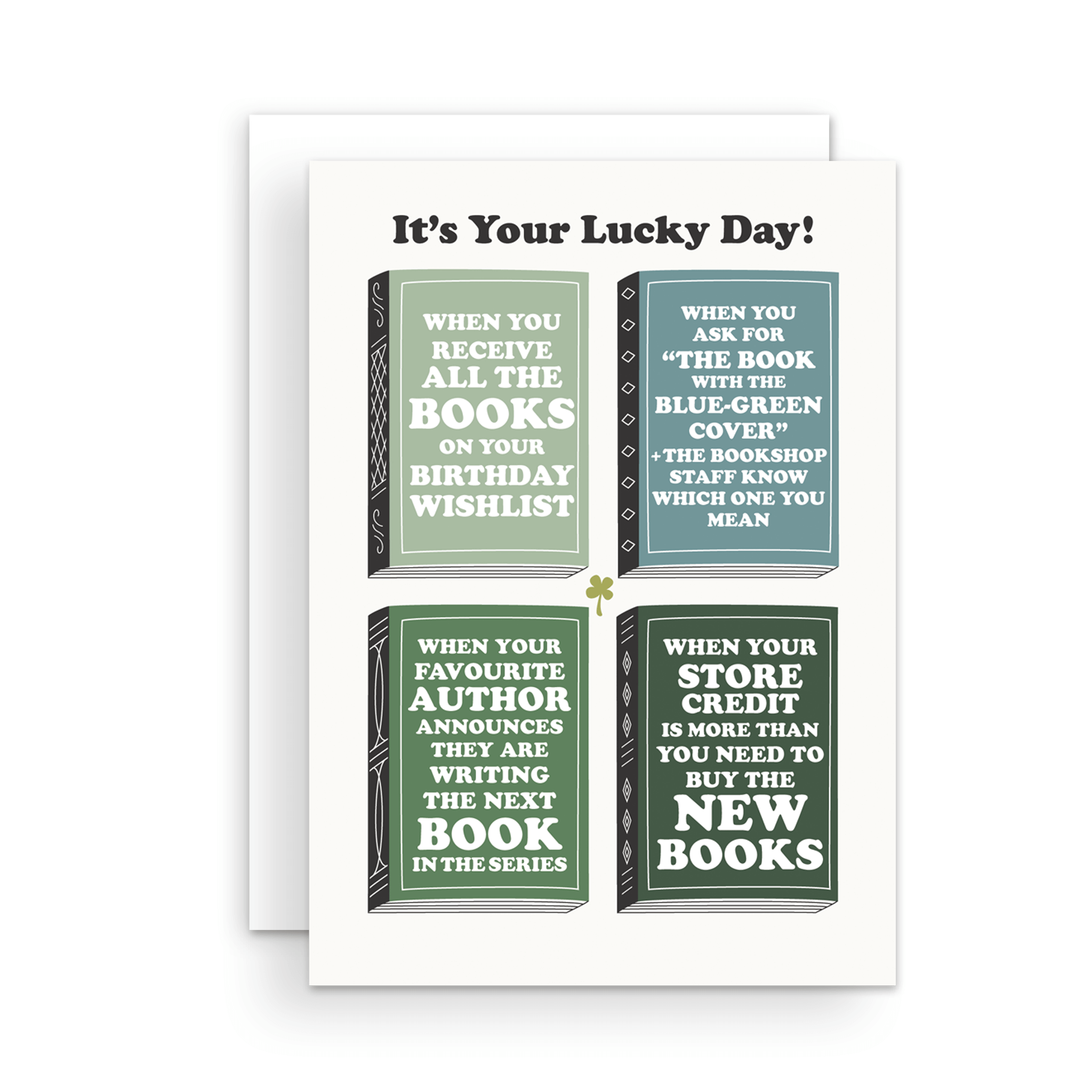 Funny bookish card that says "It's Your Lucky Day" with 4 book covers: