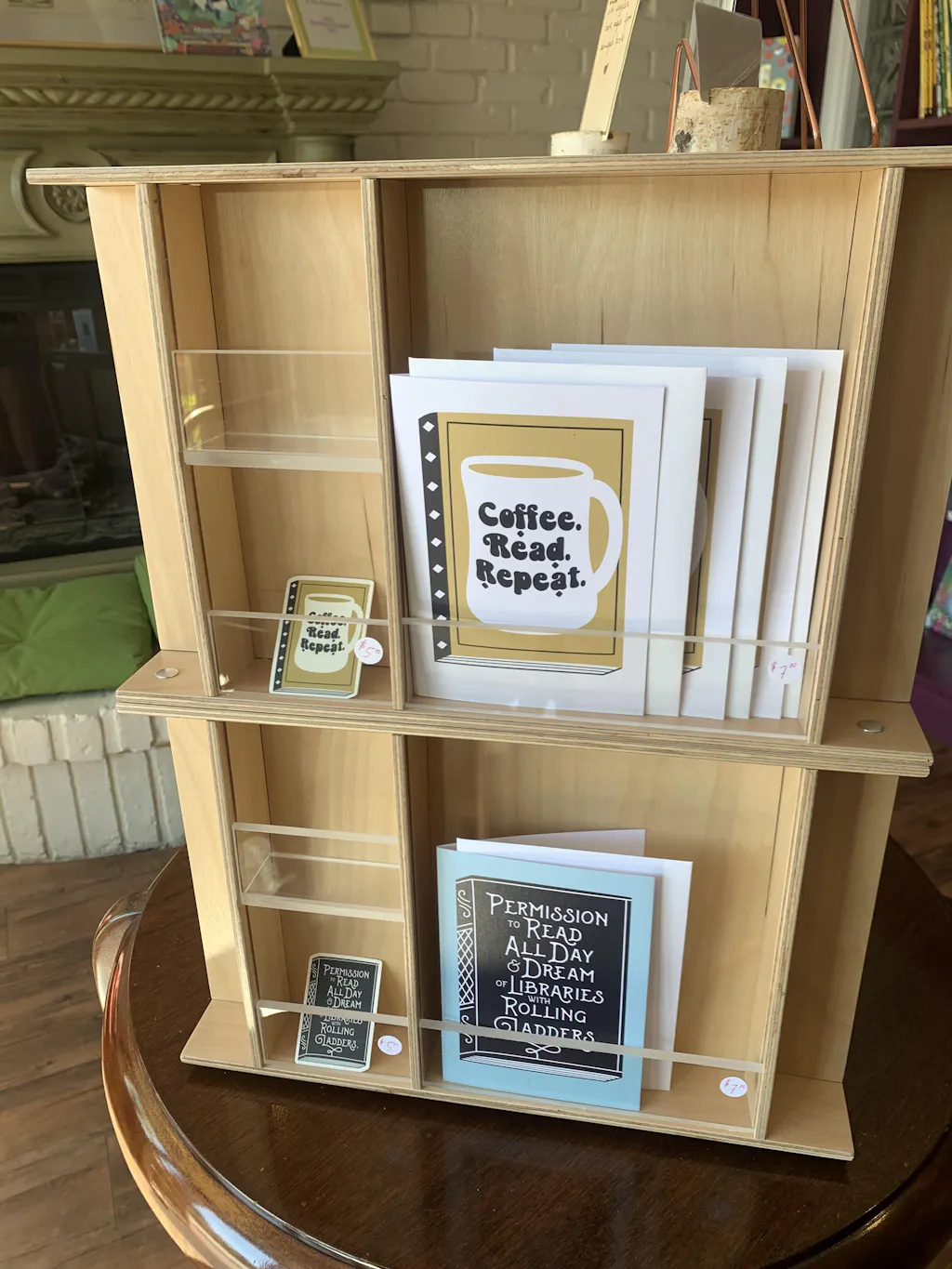 This card + sticker combo come with a matching matte vinyl sticker attached with removable glue over the book cover image. (After the sticker is removed, there is still a printed image underneath.)