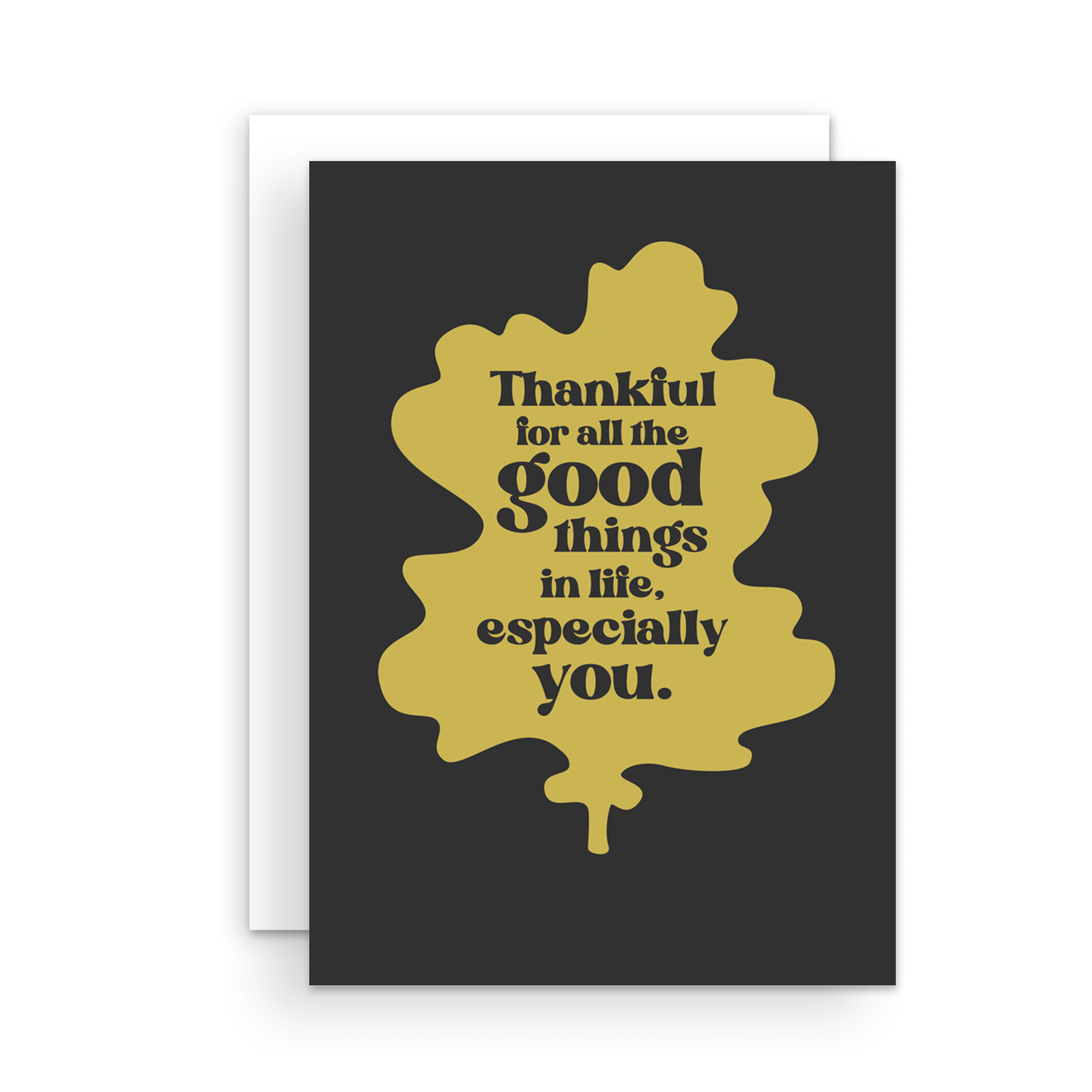 A card with the words "Thankful for all the good things in life, especially you." written on a drawing of a mustard yellow leaf on a black background.