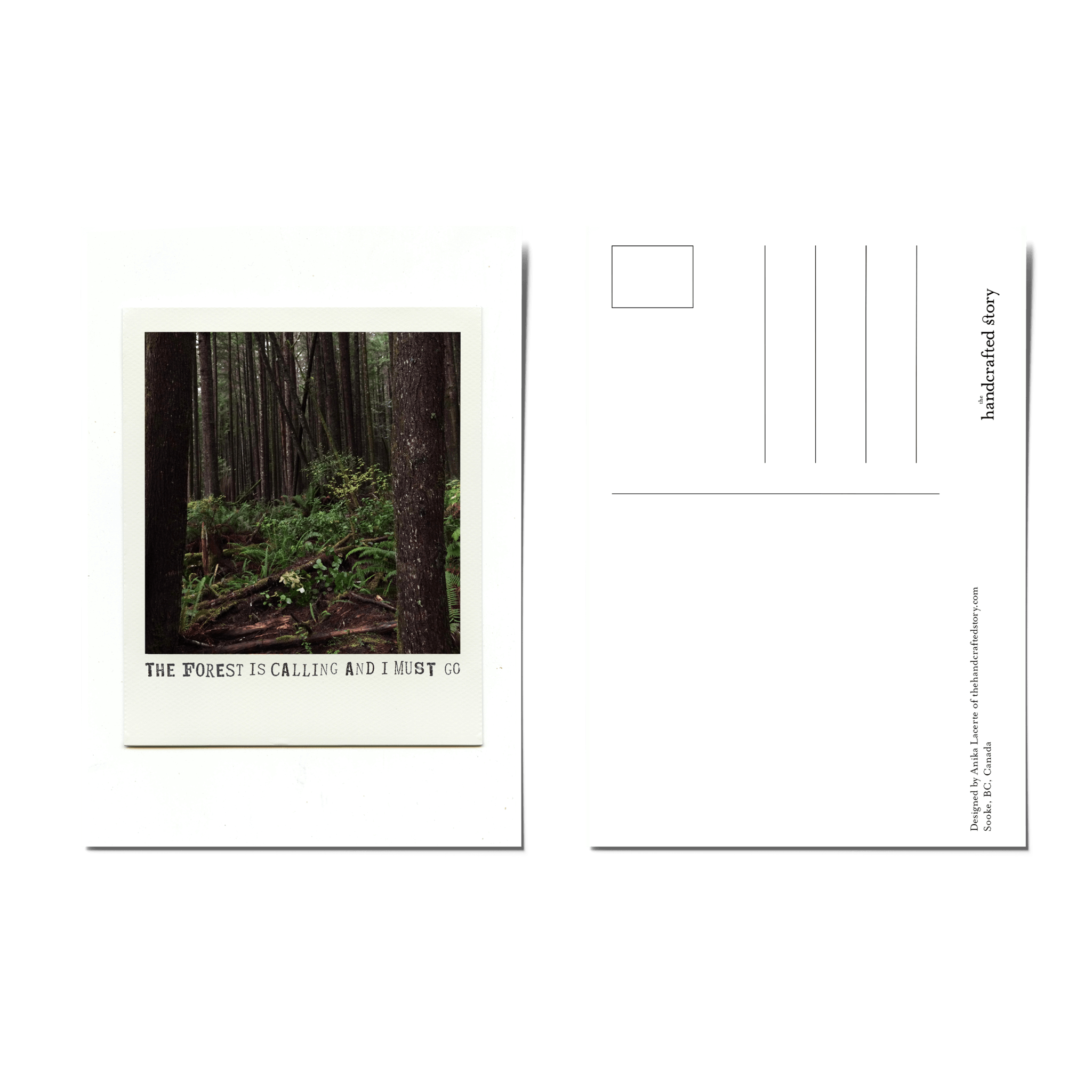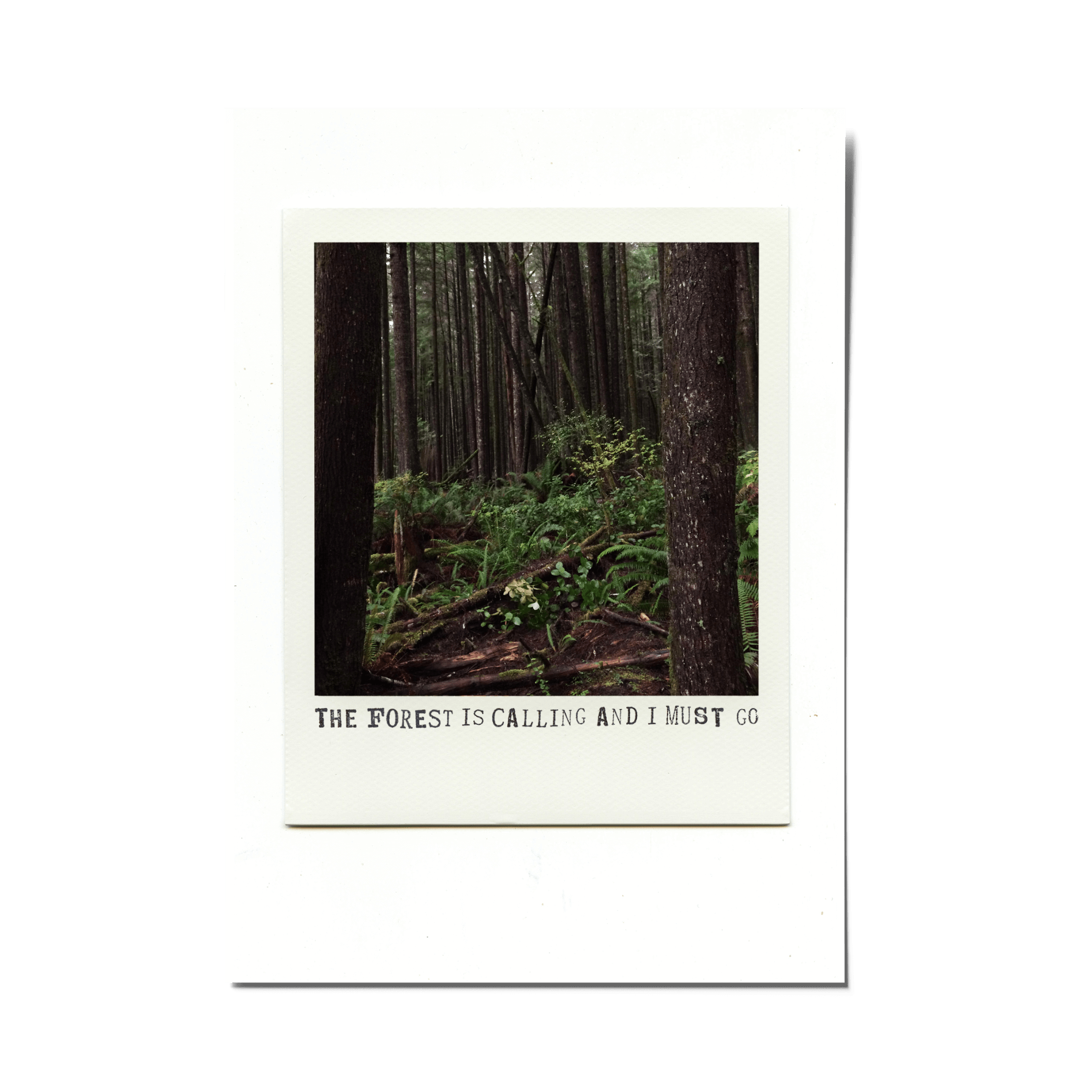 The photo appears on a polaroid-like background with the hand-stamped words “The forest is calling and I must go”.