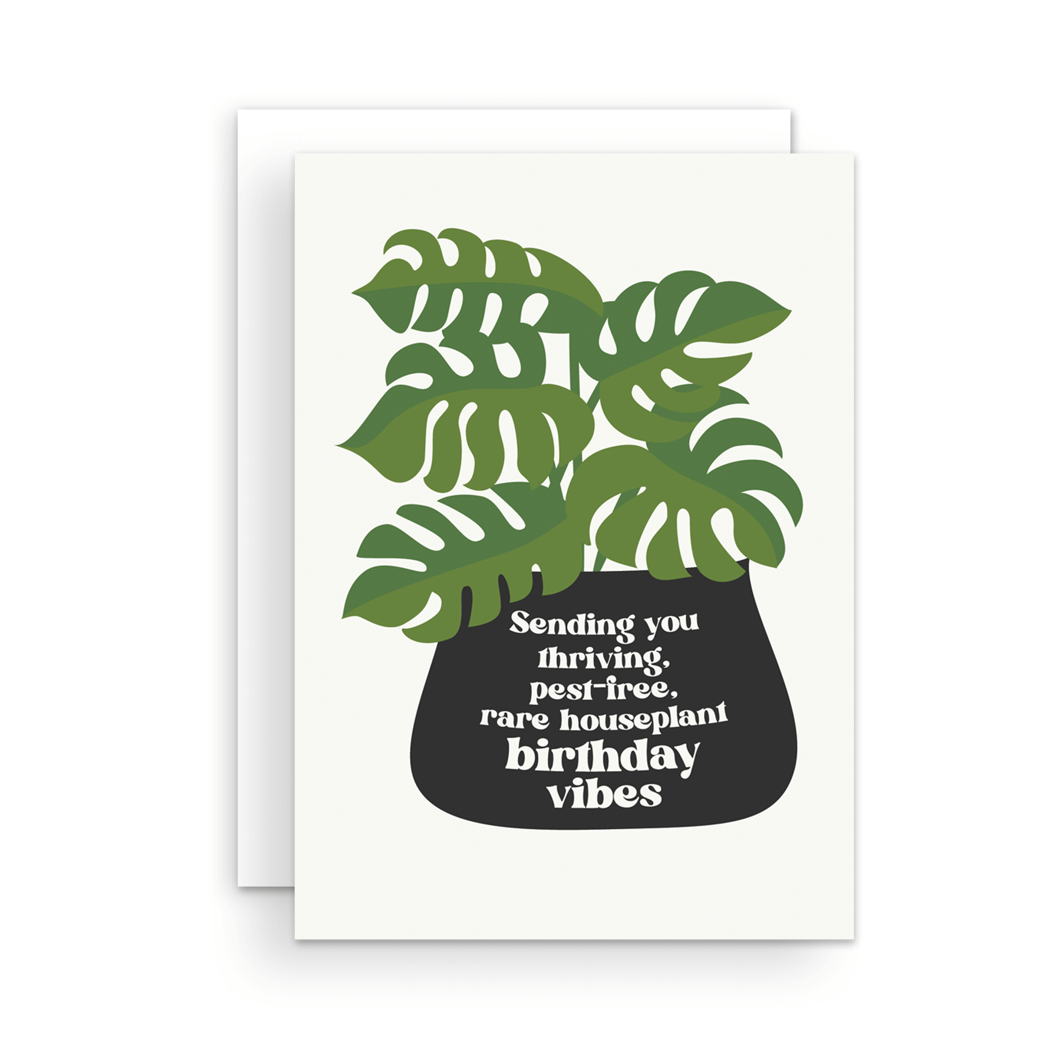 A card with the words "Sending you thriving, pest-free, rare houseplant birthday vibes" on a drawing of a potted houseplant on a white background.