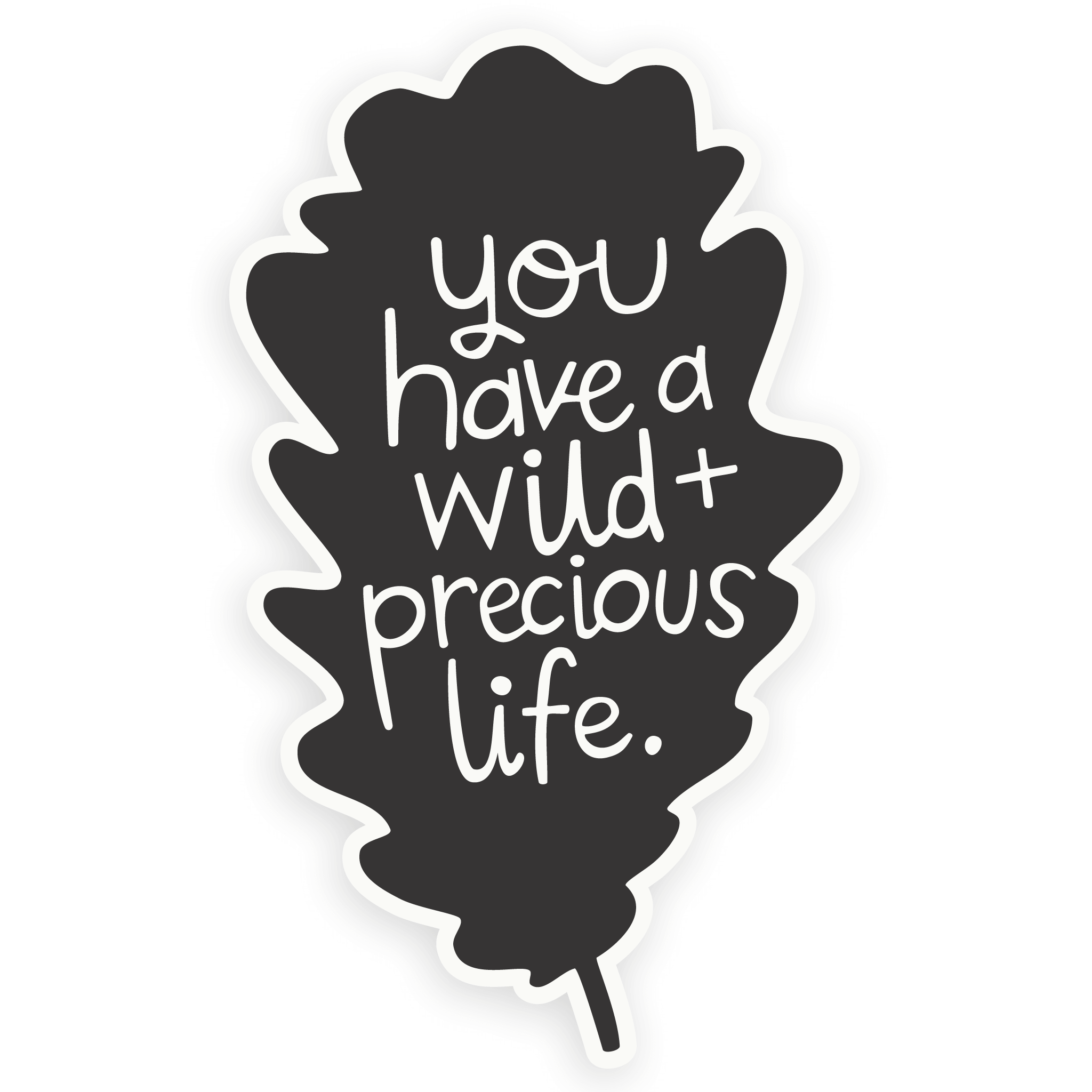 A black and white sticker that says "You have a wild + precious life." on a drawing of a leaf silhouette.